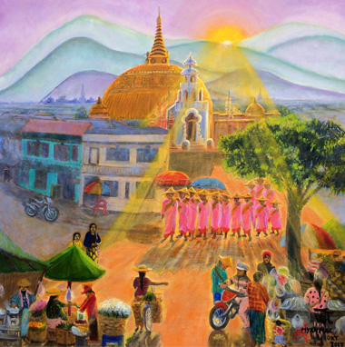 | Titel: Impressie van Myanmar Datum: Oktober 2017 Techniek: Olieverf op canvas Afmetingen: 100x100 cm | |