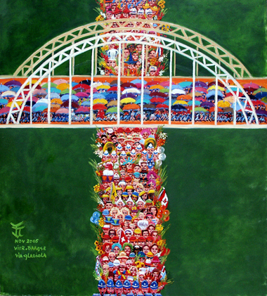 Het is dan een opeen gepakte deinende fleurige massa, die dan binnenkomt lopen De vlak verdeling op het schilderij vertegenwoordigt de bierdaagse vlag, 4 groene vlakken , verdeeld door een oranje kruis, hier ingevuld door lopers.