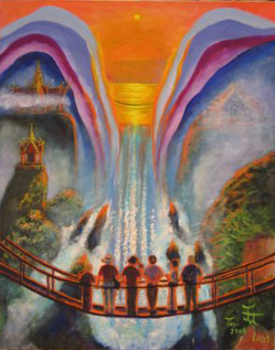 Omschrijving: Geinspireerd op een mooie waterval met de ondergaande zon . Het schilderij is een mengsel van Thai en Laos De ""Wat"s( Thai woord voor tempel) zijn Thai. De Witte Wat rechts , bijna niet meer zichtbaar is een wat gebouwd door een beroemd Thai kunstenaar . Voorts is de touwbrug altijd fascinerend Inbalans I(niet gemakkelijk) hangend boven de waterval .......fantastisch g |